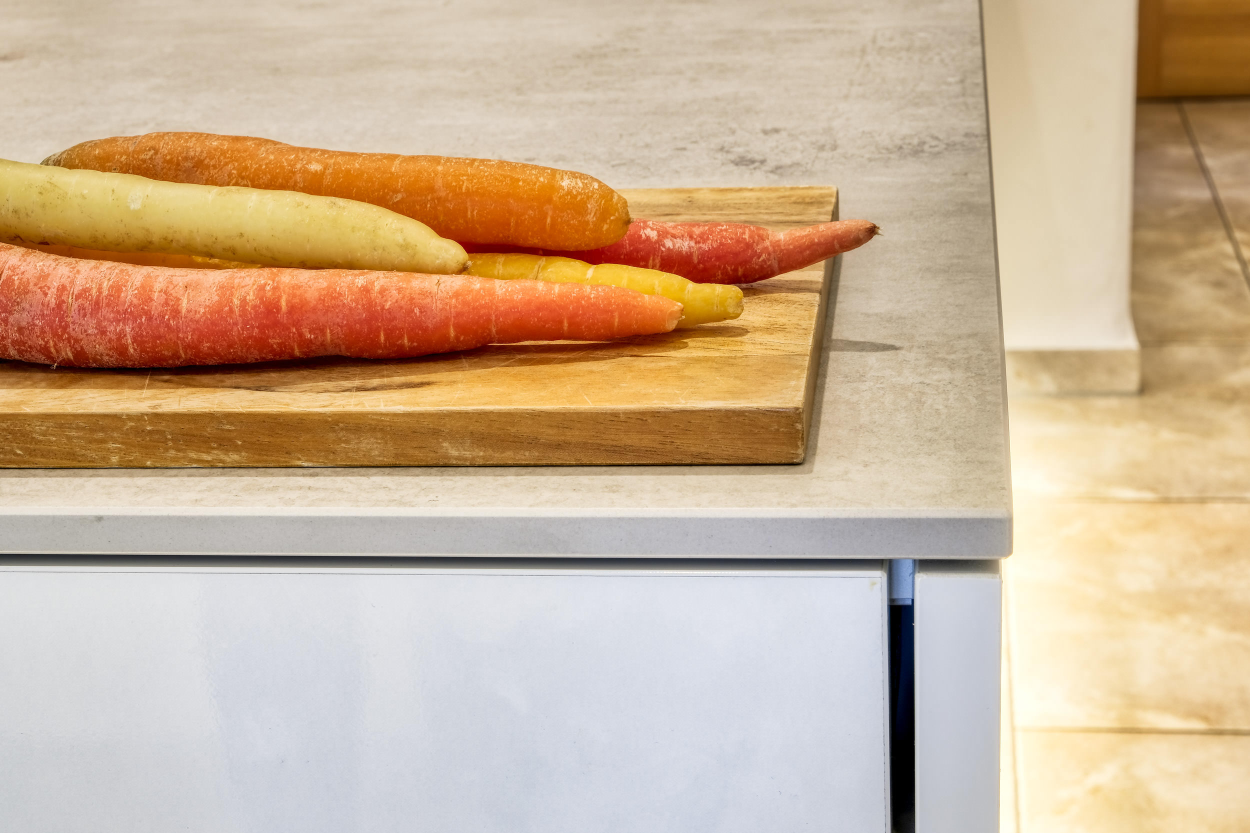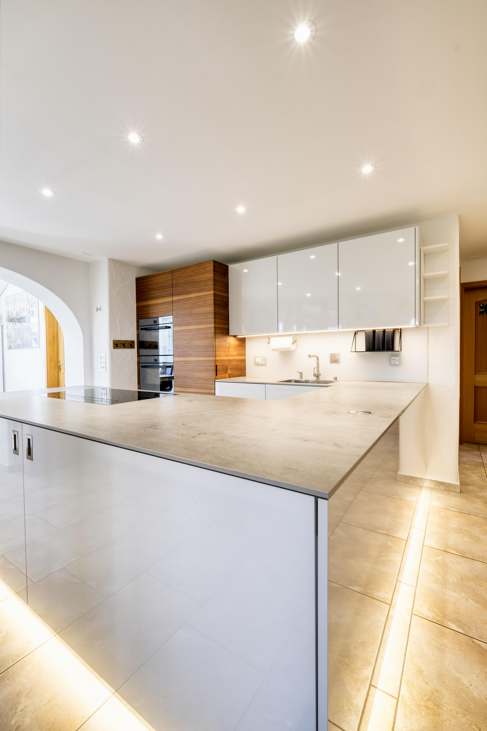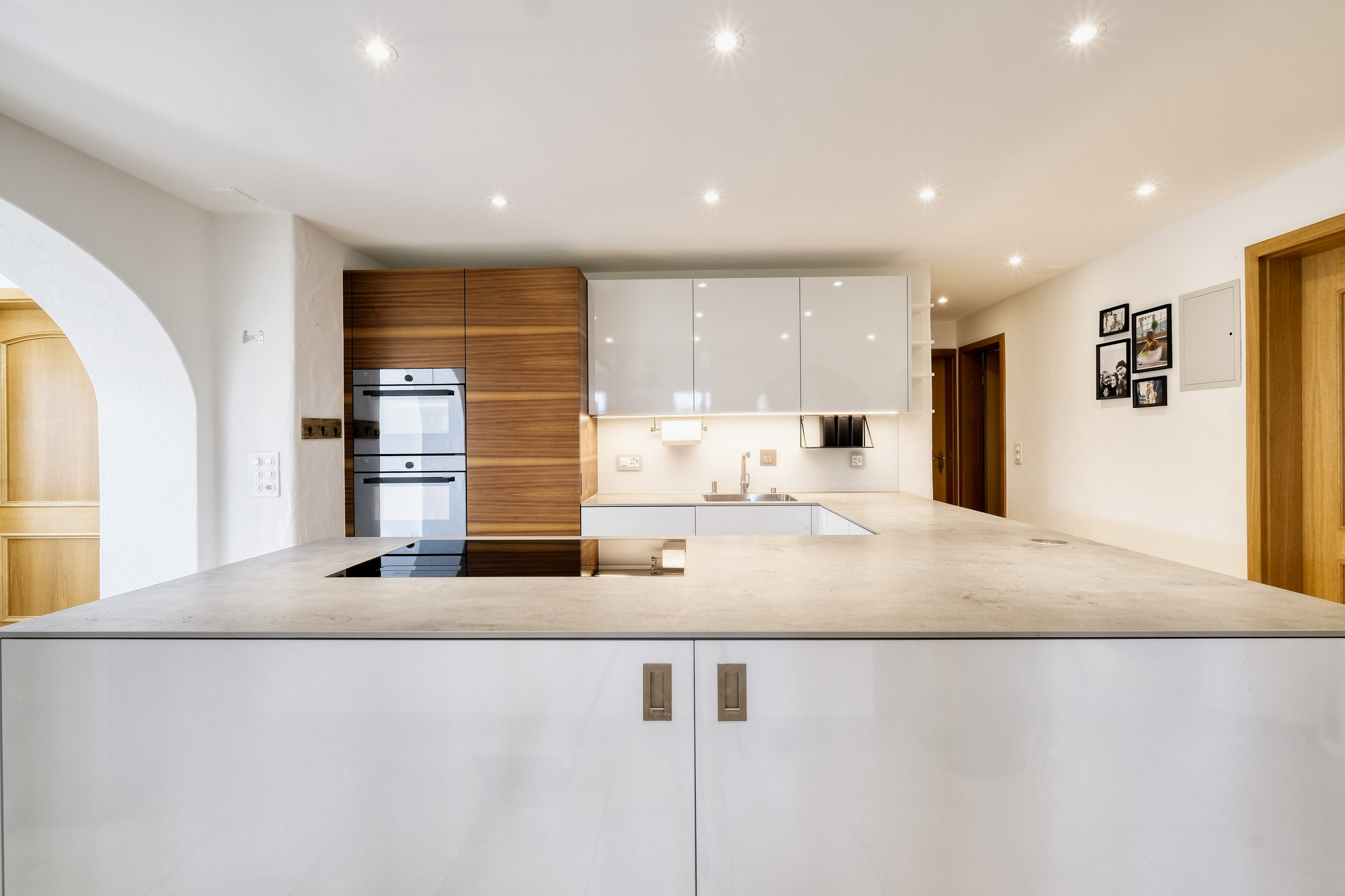 Exklusivität verströmt auch die Abdeckung aus Keramik Neolith Beton, einem äusserst kratzfesten, harten Material von beeindruckender Anmutung. Die frontbündigen Schiebetüren sind mit Muschelgriffen aus Aluminium in Chromstahl-Optik versehen. Die Rückwand aus satiniertem, weiss emailliertem Glas trägt ebenso zum hochwertigen Ambiente bei wie die Hochschränke, die mit liegendem Nussbaumfurnier belegt sind.